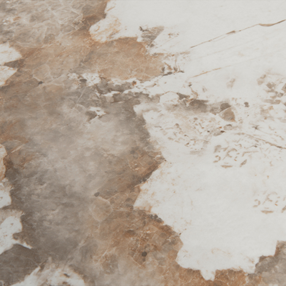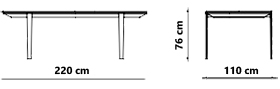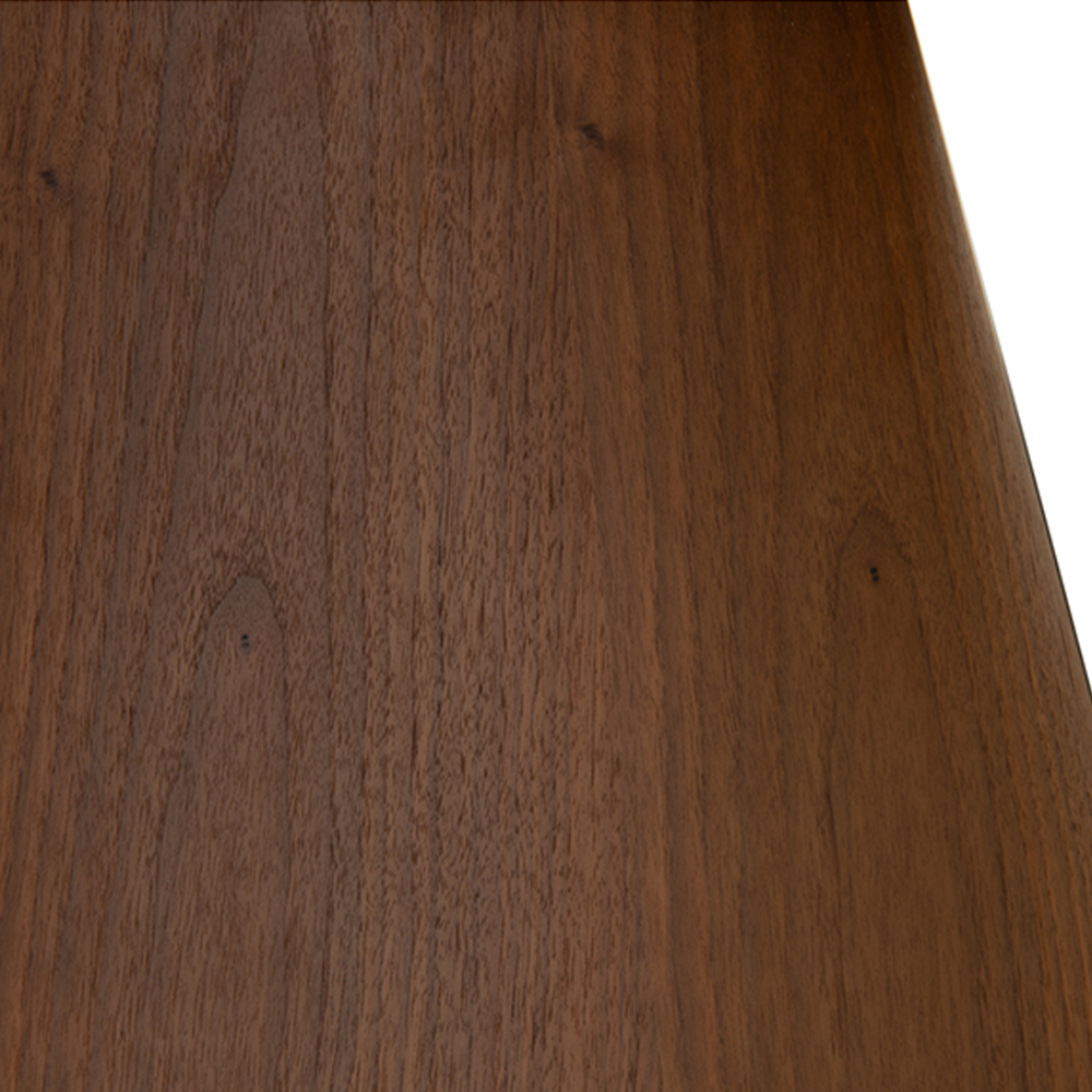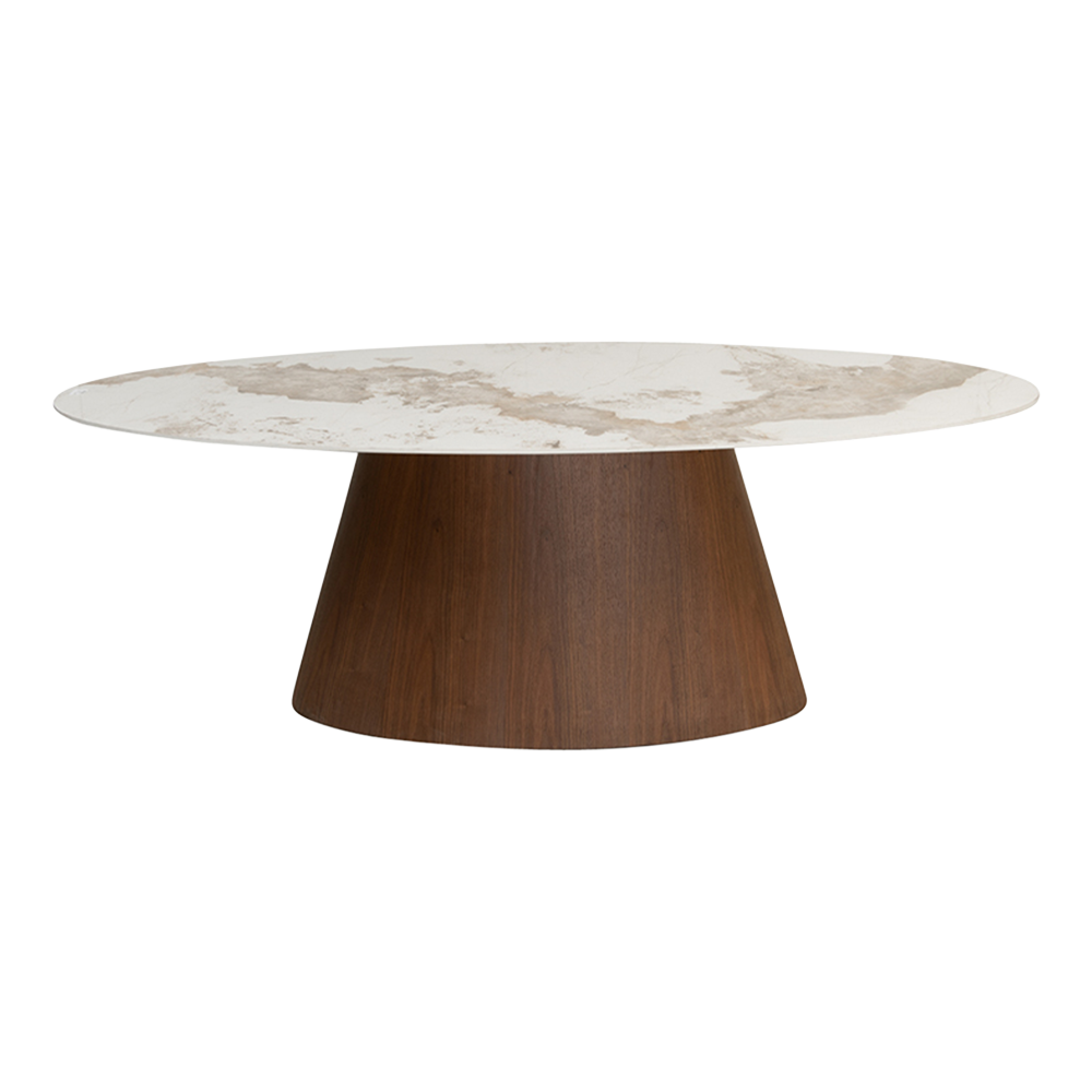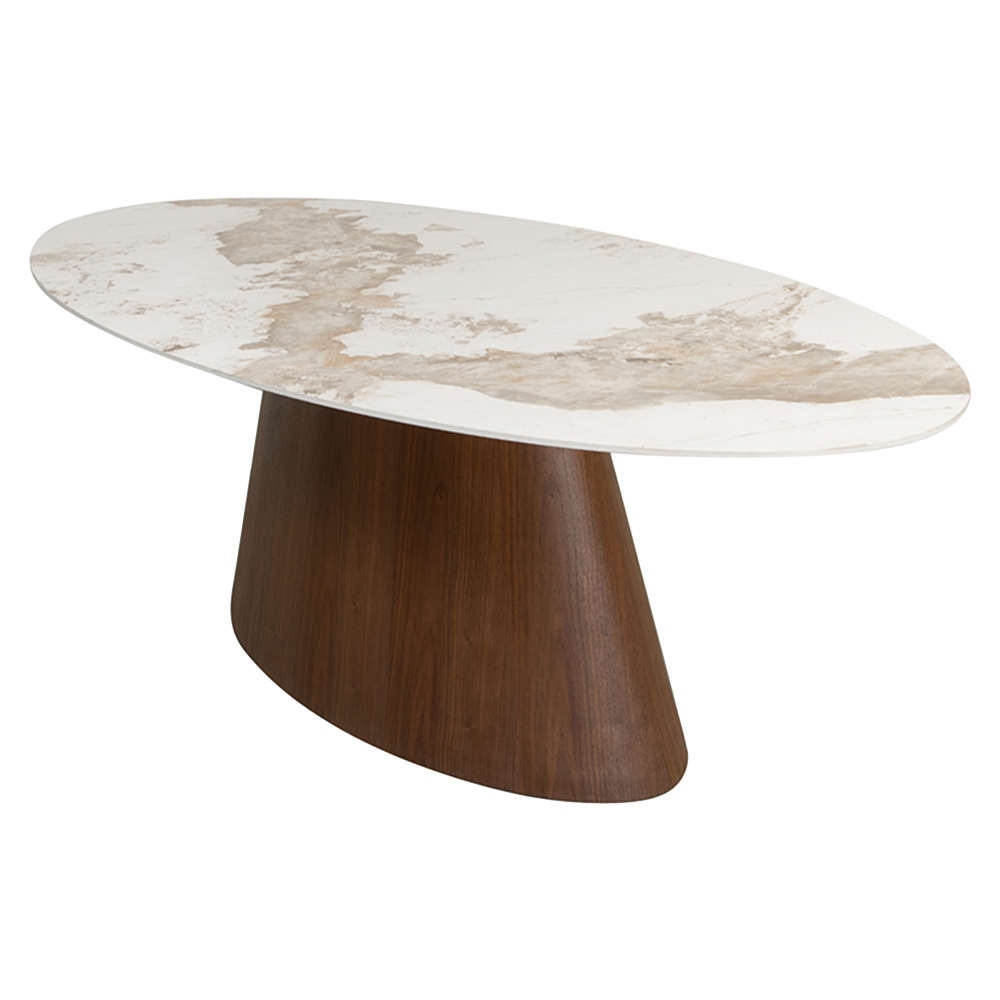 Mesa de refeições com pé em nogueira, e tampo em cerâmica.