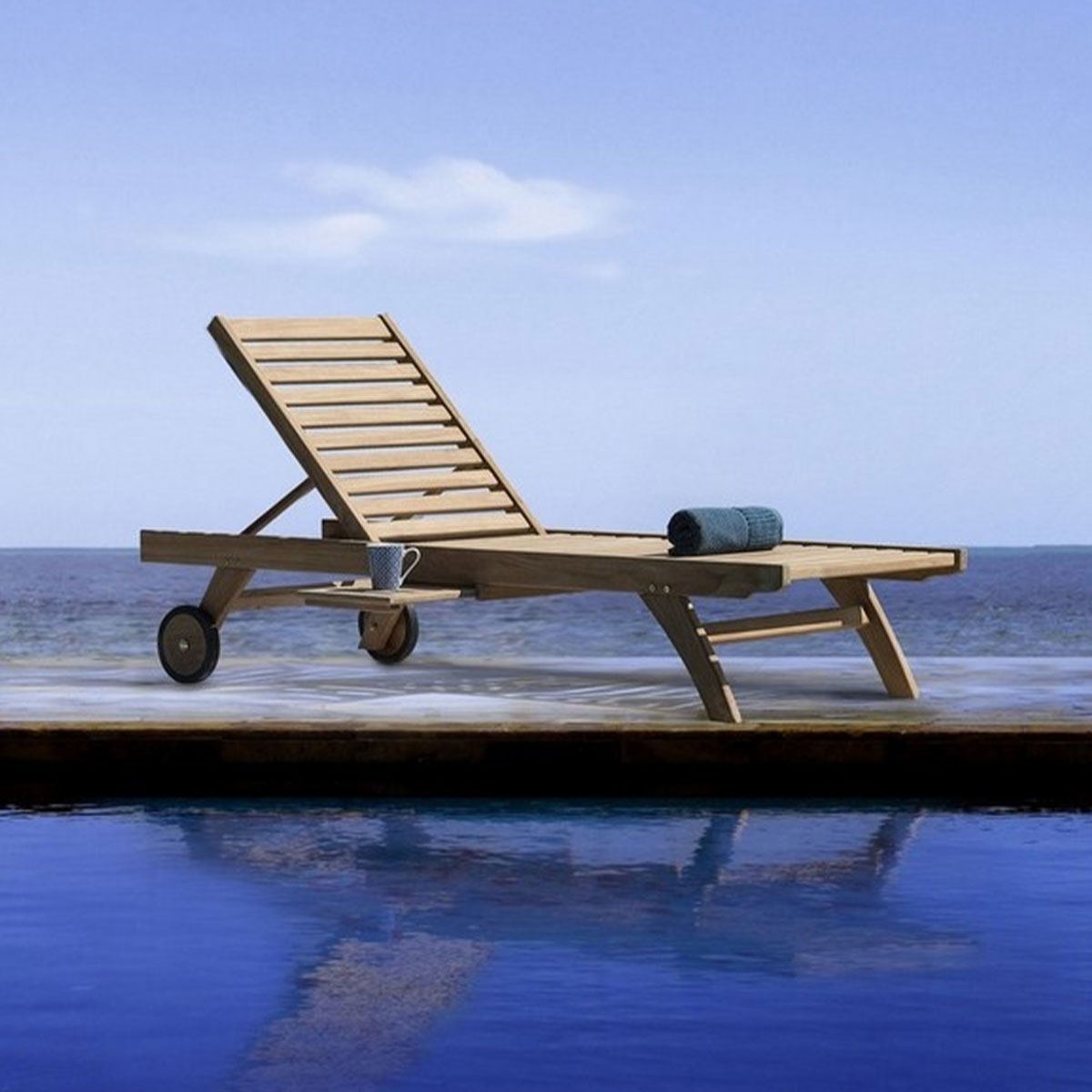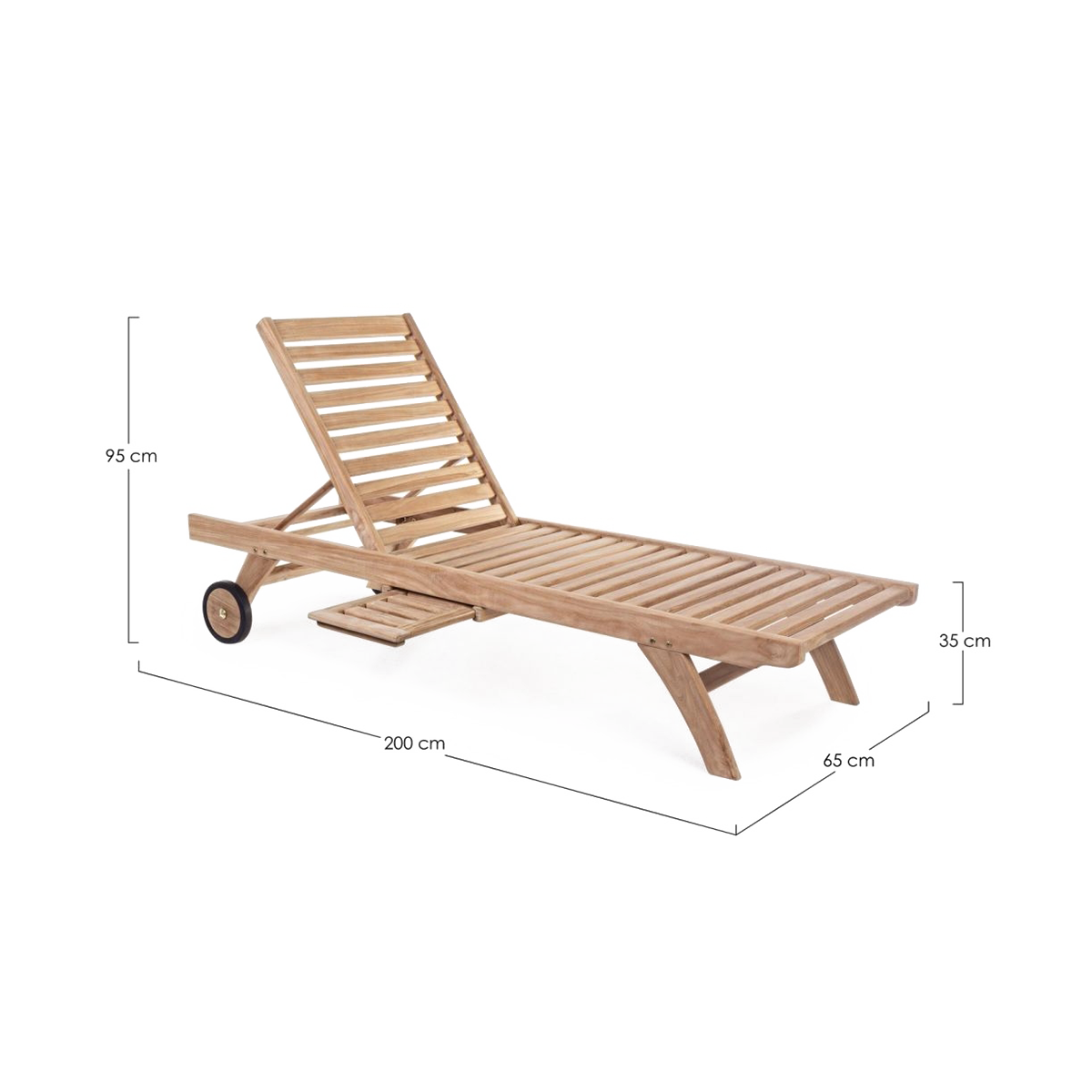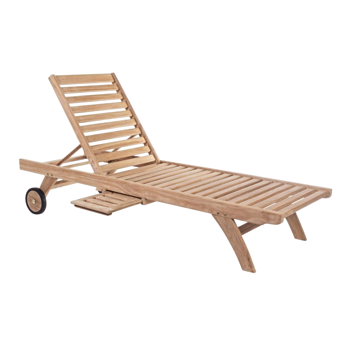 Espreguiçadeira em madeira teka, com rodas, e encosto regulável