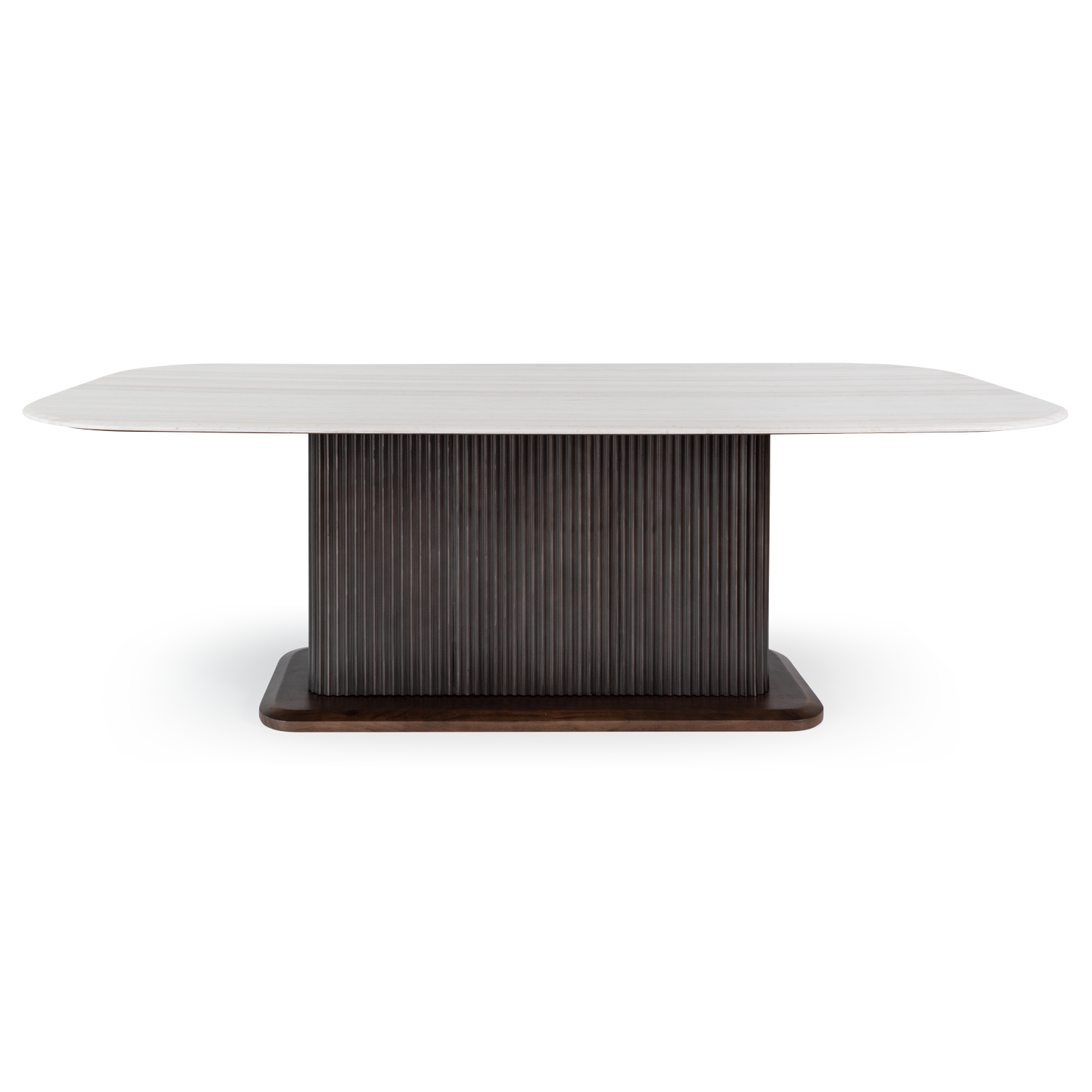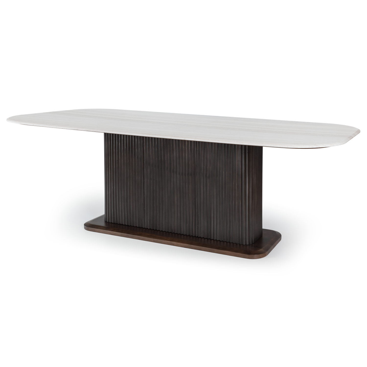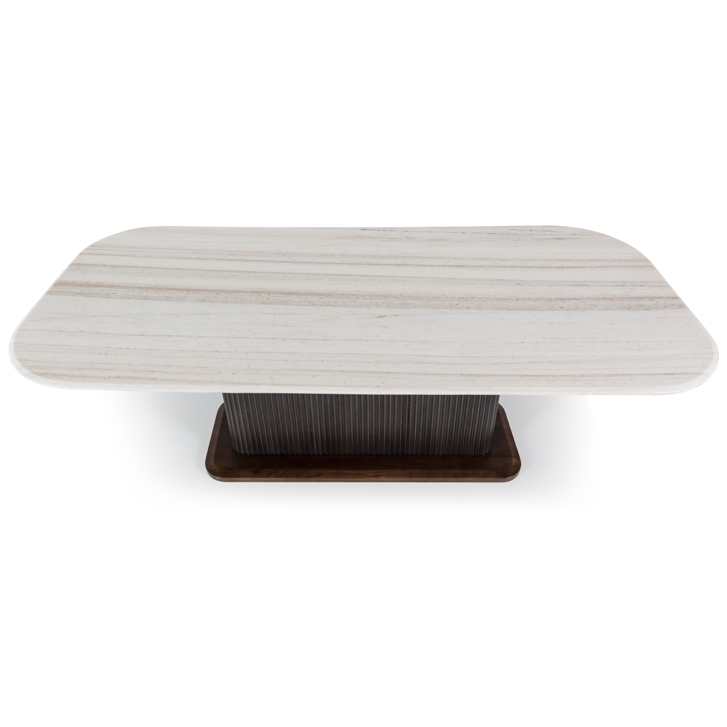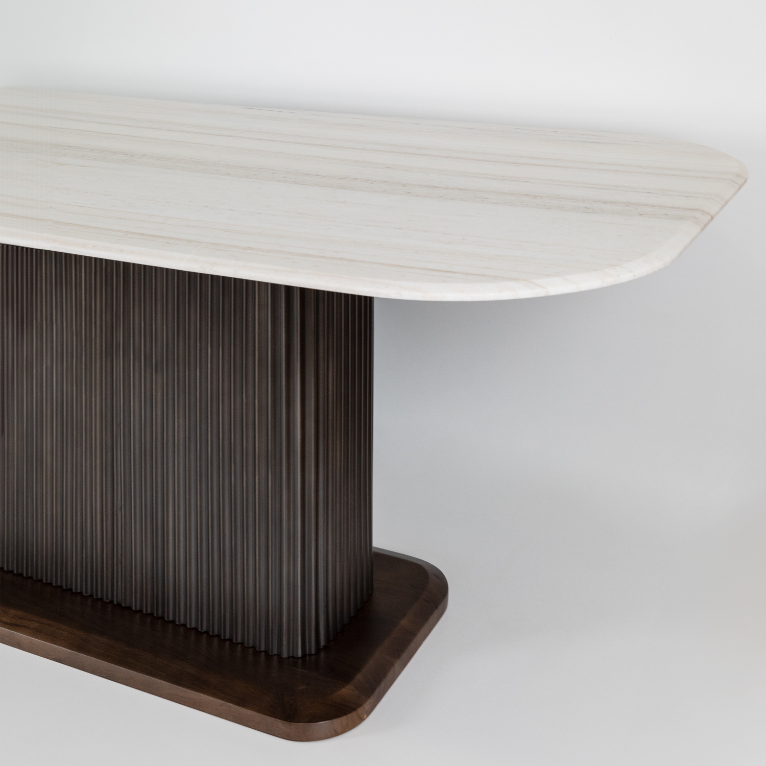 Mesa de refeições com pé metálico com efeito de madeira e tampo em mármore.